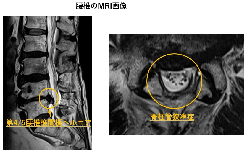 MRI所見で腰椎椎間板ヘルニア、脊柱管狭窄症を認めました。