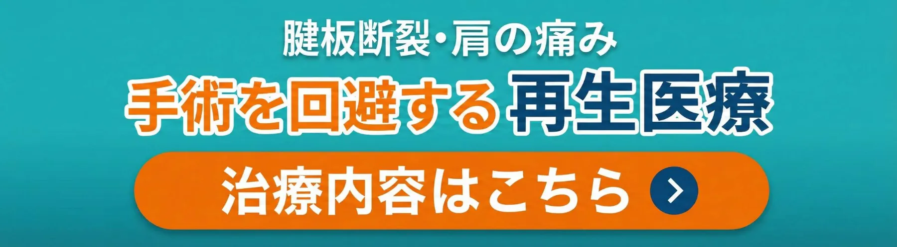 A. 可能です。以前は手術適応とされるケースが多かったですが、完全断裂であっても、再生医療によって周囲の組織が強化され、痛みや機能が改善するケースは多く経験しています。ただし、断裂してからの期間や筋肉の状態によっては効果が出にくい場合もあるため、まずはMRI等での診断が必要です。